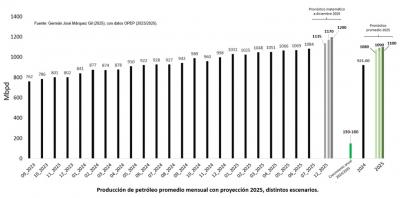 A cinco meses de finalizar 2025 surgen algunas interrogantes; ¿en cuánto cerrará la producción de petróleo en Venezuela?, ¿cuál será el crecimiento anual?, ¿de qué porcentaje de crecimiento estamos hablando?, sin pretender ser Nostradamus está documentado, como a principio de año indiqué verbalmente y por escrito, que la producción petrolera estaría rondando sobre 1.200.000 barriles promedio días a finales del 2025. Con suficientes cifras reales y valiéndome de análisis proyectivos, extrapolando datos existentes y usando distintas ecuaciones matemáticas, presento tres escenarios a saber: