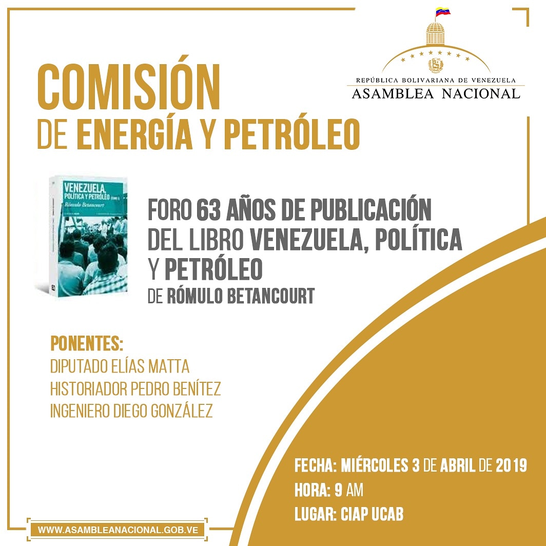 La Comisión de Energía y Petróleo auspiciará un foro con motivo de los 63 años de la publicación del libro "Venezuela, Política y Petróleo" del presidente venezolano Rómulo Betancurt. El foro tendrá como conferencista al presidente de la referida comisión, el diputado Elías Matta; al historiador Pedro Benitez, presidente de la Fundación Rómulo Betancourt; y al ingeniero Diego González / Hora: 9 a.m.